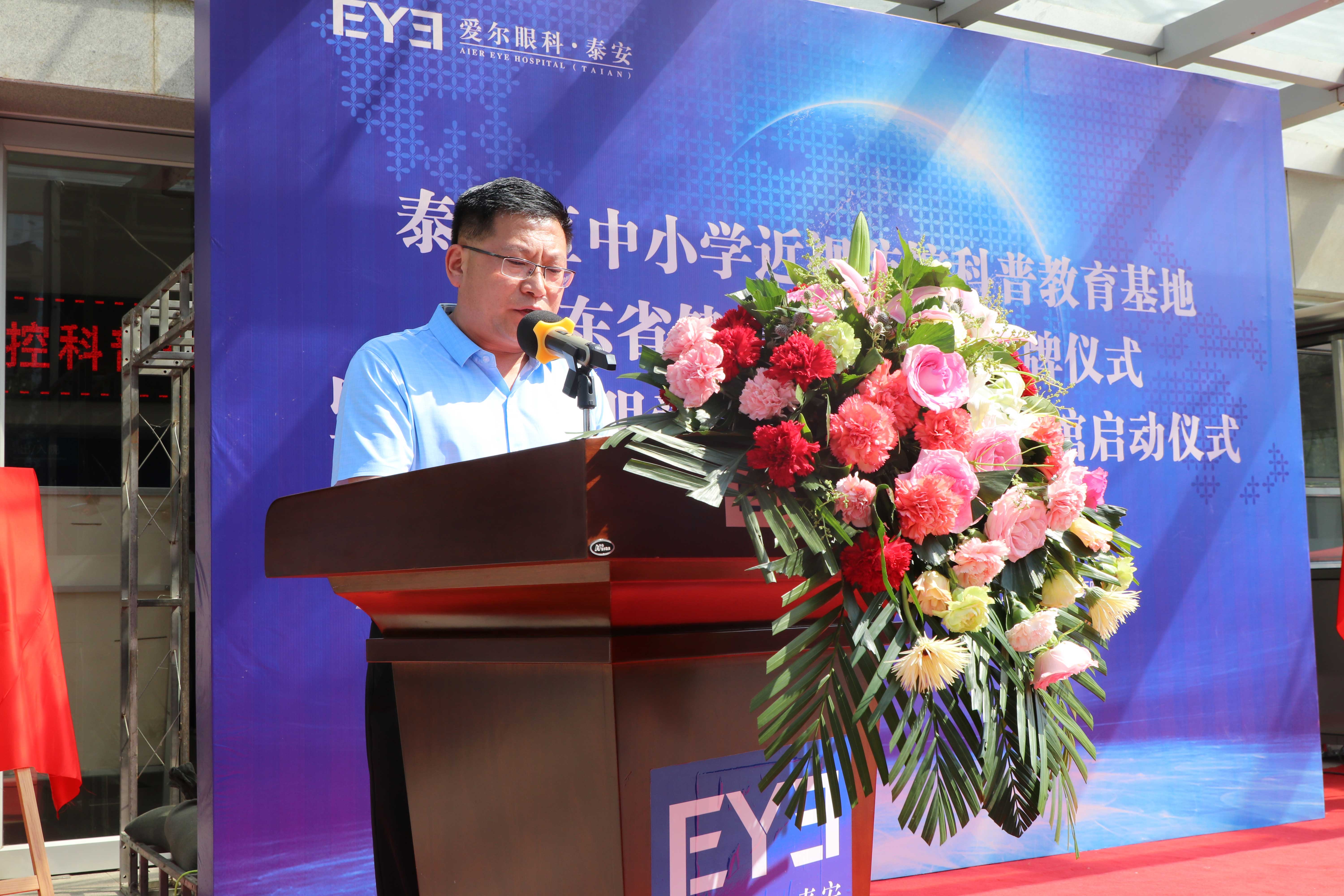 ? ? ? ?九點(diǎn)二十分,“山東省健康教育基地”和“泰山區(qū)中小學(xué)近視防控科普教育基地”正式揭牌。隨后,泰山區(qū)衛(wèi)生健康局黨組成員、副局長寧方莉、泰山區(qū)教育和體育局副局長高京杰、泰山區(qū)疾病預(yù)防控制中心副主任梁洪濤、泰安光明愛爾眼科醫(yī)院CEO楊敬昌、院長范傳峰、社會(huì)公益部主任王海燕登臺(tái),宣布泰安市眼健康科普館正式啟動(dòng),并向市民免費(fèi)開放。